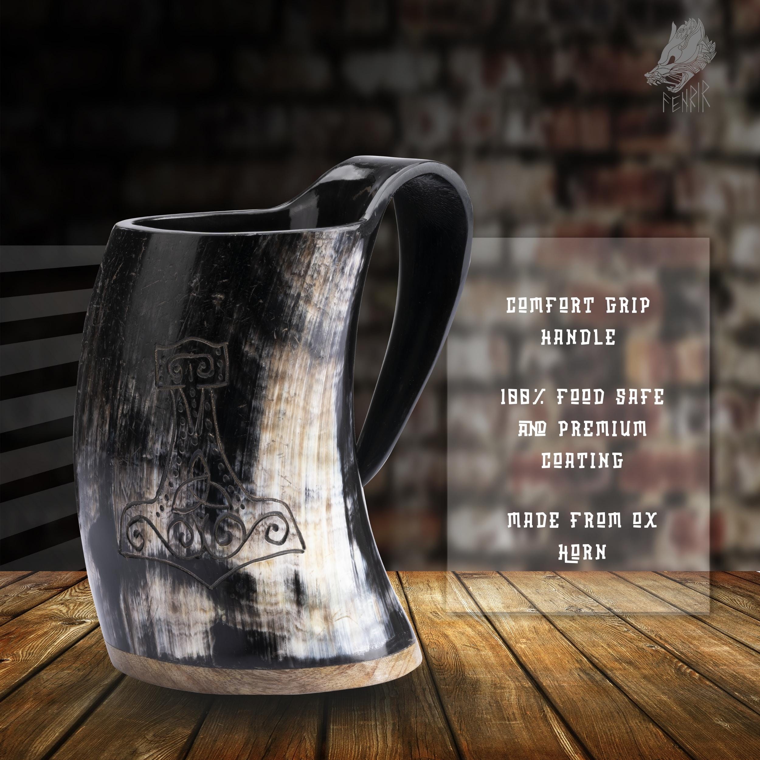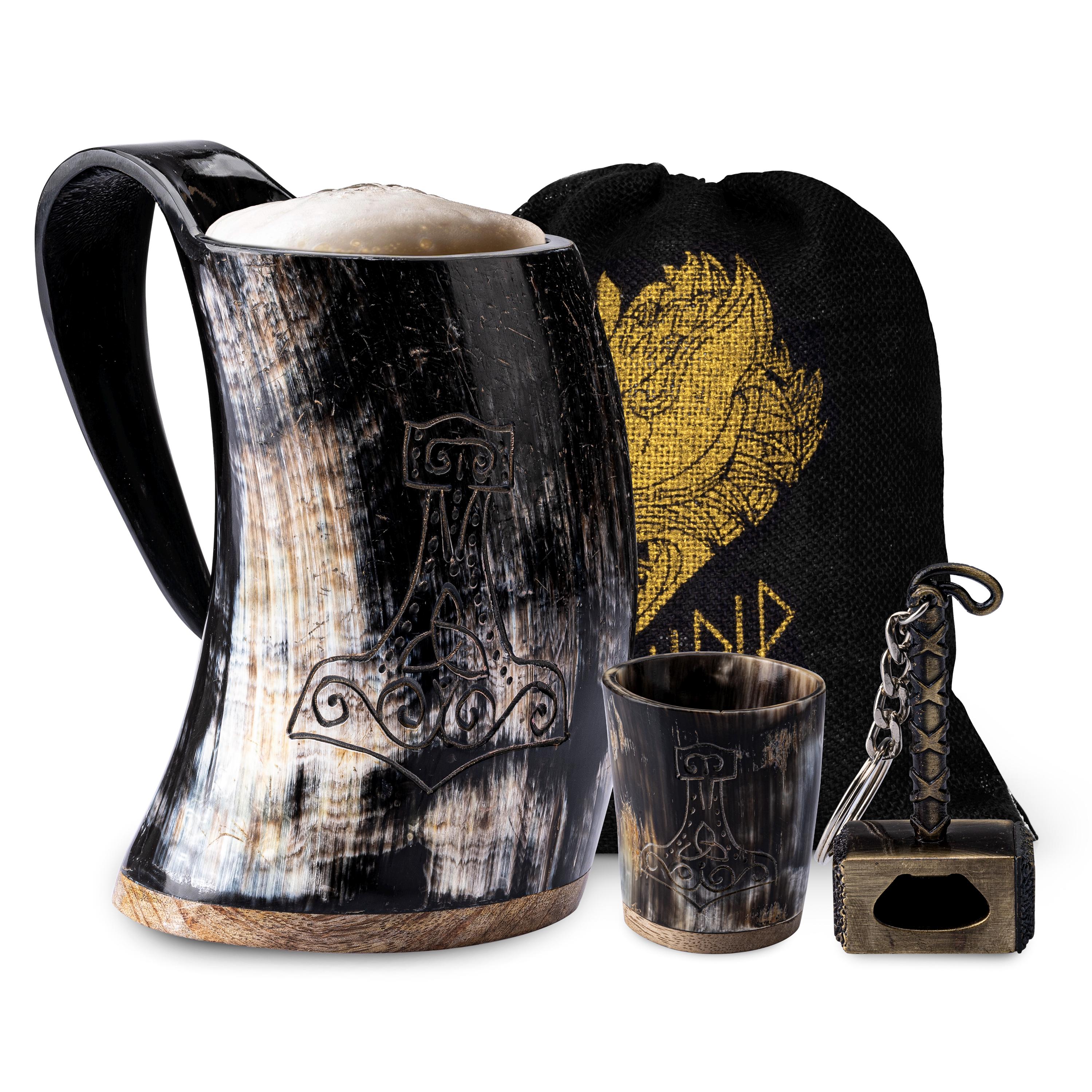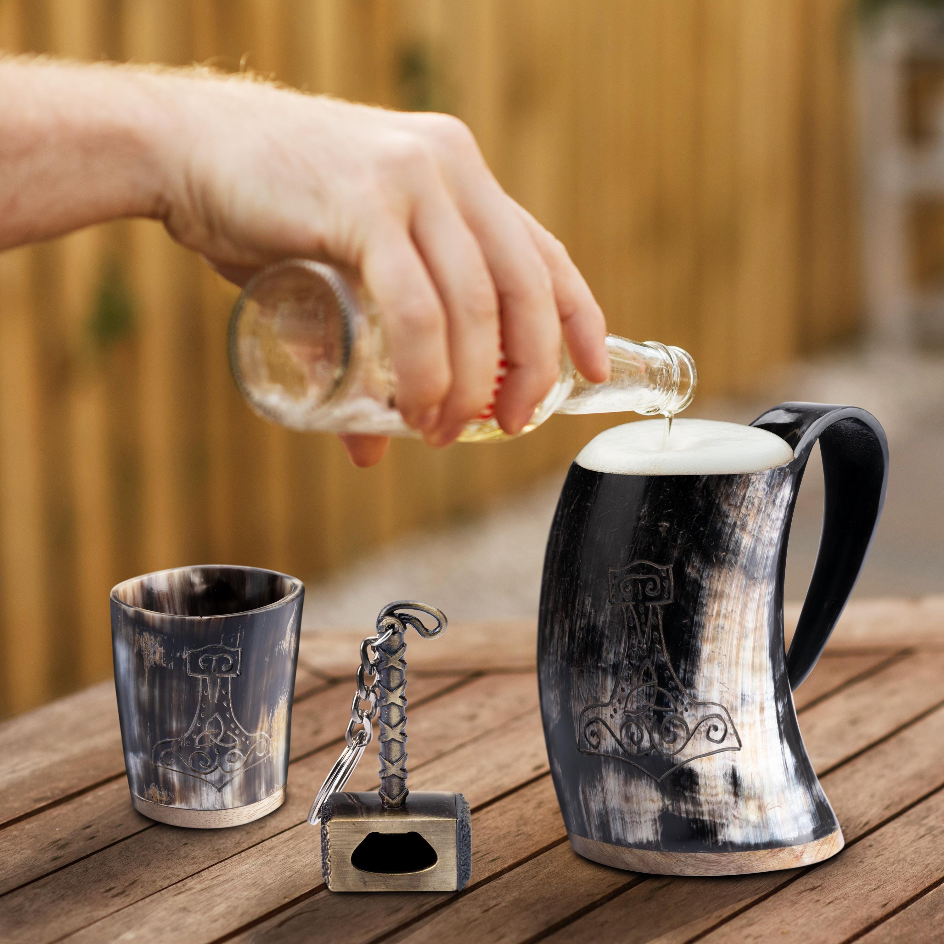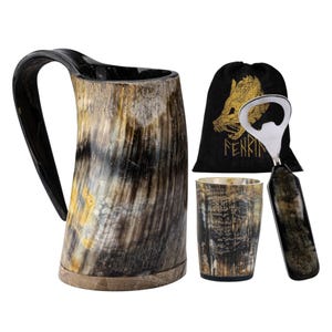FENRIR VIKING DRINKING HORN MUG SET - The Fenrir viking drinking horn mug set is a combination that includes a Fenrir viking horn mug with a bottle opener that are stylish and durable viking horn products. UNIQUE HANDMADE OX HORN PRODUCT - Crafted from 100% authentic and ethically sourced ox horn, each FENRIR viking drinking horn mug is a testament of superior craftsmanship. Brace the spirit of the Norse with our handcrafted medieval style natural beer mugs. A PERFECT ALL-SEASON GIFT FOR MEN – A perfect gift for your husband, dad, or buddy on Christmas, New Year, Father’s Day, birthdays, or anniversaries. It’s a memorable way to celebrate any man who appreciates handcrafted quality and Norse-inspired design