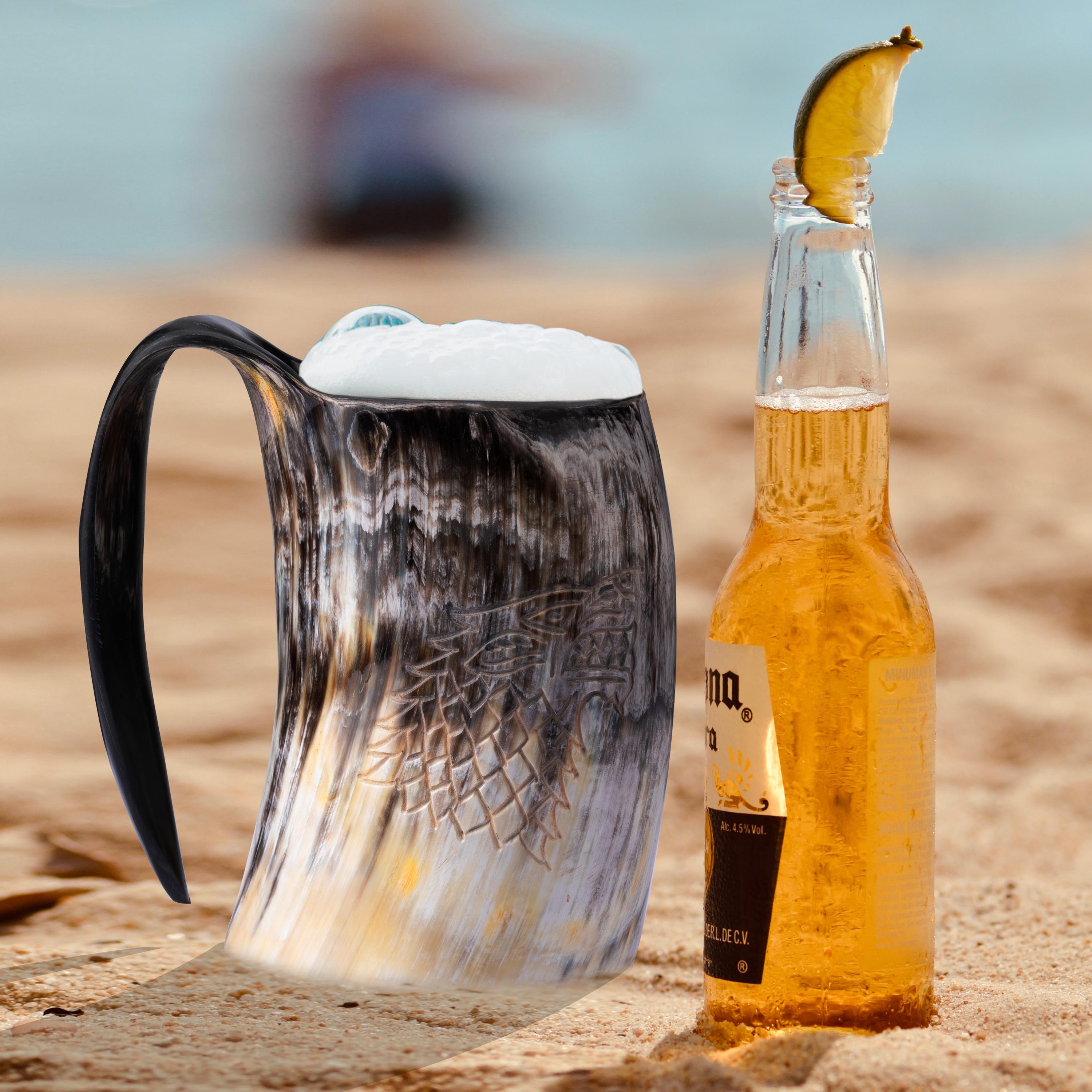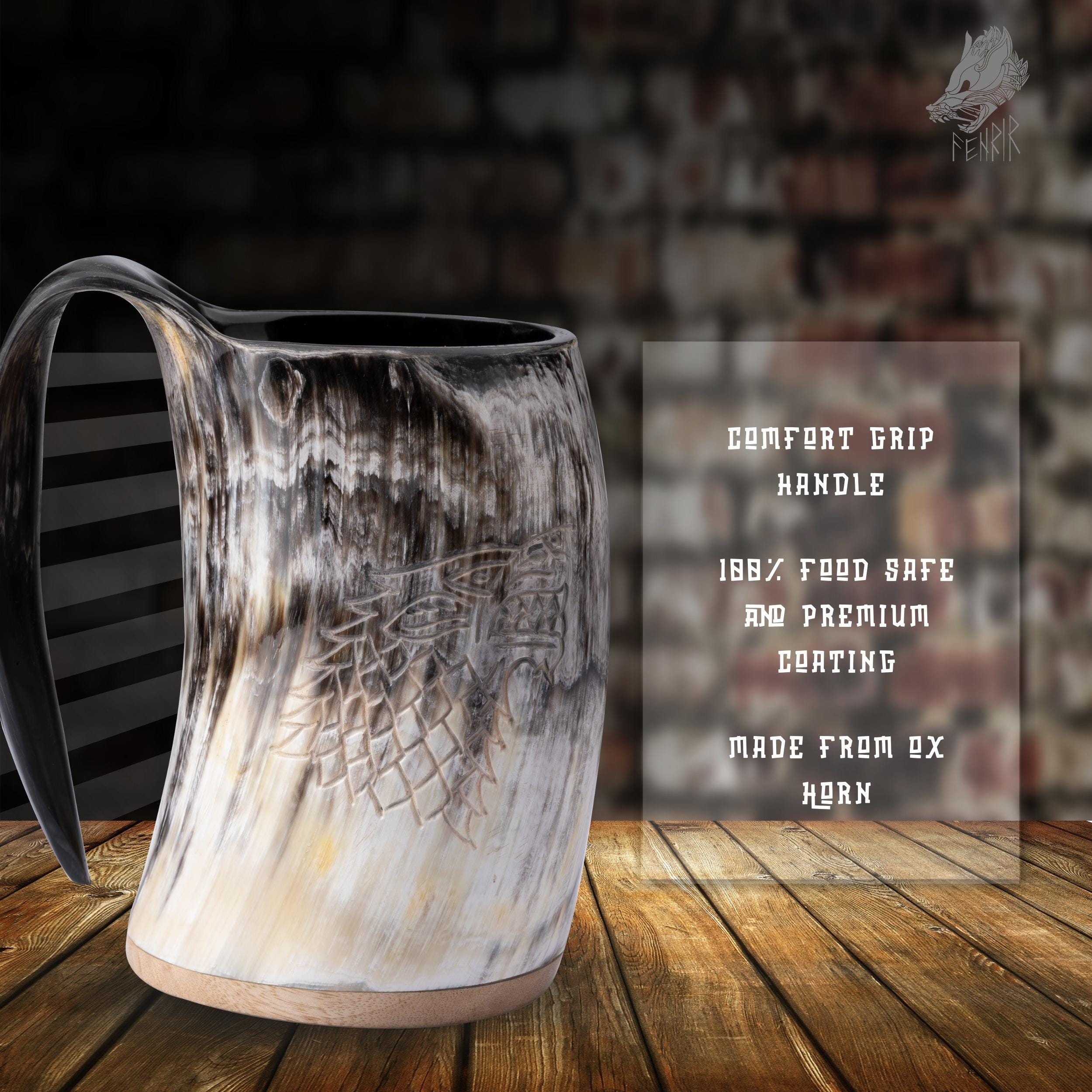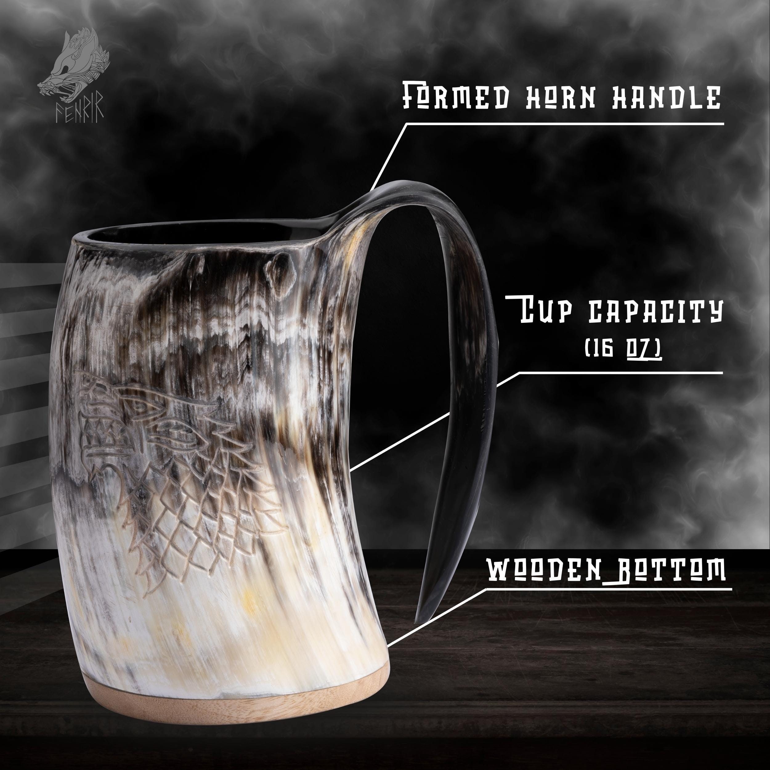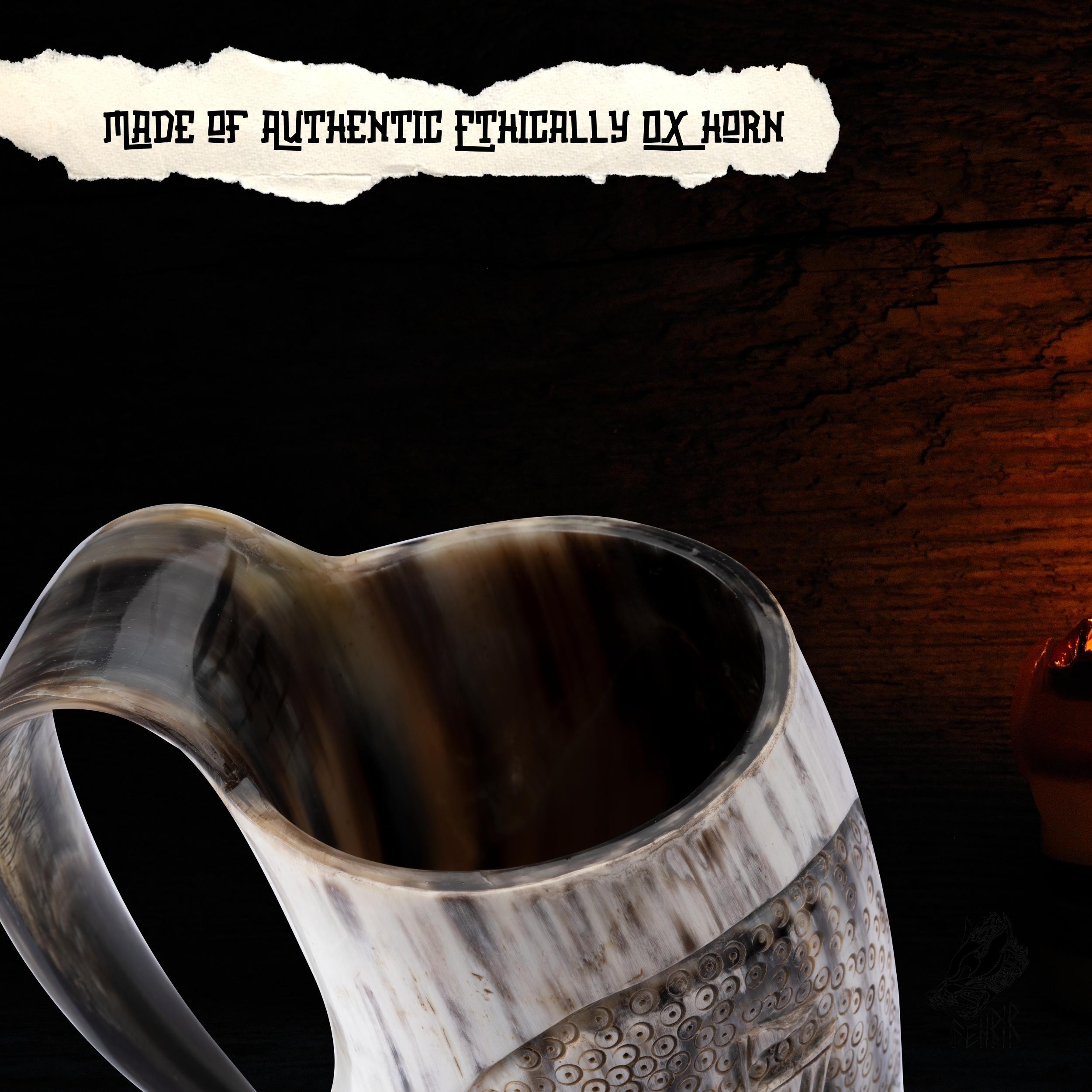 FENRIR VIKING DRINKING HORN MUG SET - The Fenrir viking drinking horn mug set is a combination that includes a Fenrir viking horn mug with a bottle opener that are stylish and durable viking horn products. UNIQUE HANDMADE OX HORN PRODUCT - Crafted from 100% authentic and ethically sourced ox horn, each FENRIR viking drinking horn mug is a testament of superior craftsmanship. Brace the spirit of the Norse with our handcrafted medieval style natural beer mugs. A PERFECT ALL-SEASON GIFT FOR MEN – A perfect gift for your husband, dad, or buddy on Christmas, New Year, Father’s Day, birthdays, or anniversaries. It’s a memorable way to celebrate any man who appreciates handcrafted quality and Norse-inspired design. GENUINE & FUNCTIONAL VIKING HORN CUP – With a generous 16 oz capacity, the FENRIR horn mug is perfect for enjoying beer, mead, ale, or any drink of choice. Each mug features a unique natural finish, ensuring no two are alike—giving you a truly one-of-a-kind, authentic Viking experience. PREMIUM QUALITY & GIFT-READY – Crafted from thick, sturdy ox horn with a food-safe polished finish and a 100% leak-proof bottom, the FENRIR Viking mug ensures a safe, long-lasting drinking experience. Comes with a free spirit gift bag to protect your set—perfect for gifting or storing between adventures. SPIRITED GIFT BAG INCLUDED: Carry the legacy of the great Viking adventurers with our included gift bag, designed to keep your Fenrir Viking drinking horn mug clean and protected between uses. It's the perfect accessory for any modern-day explorer.