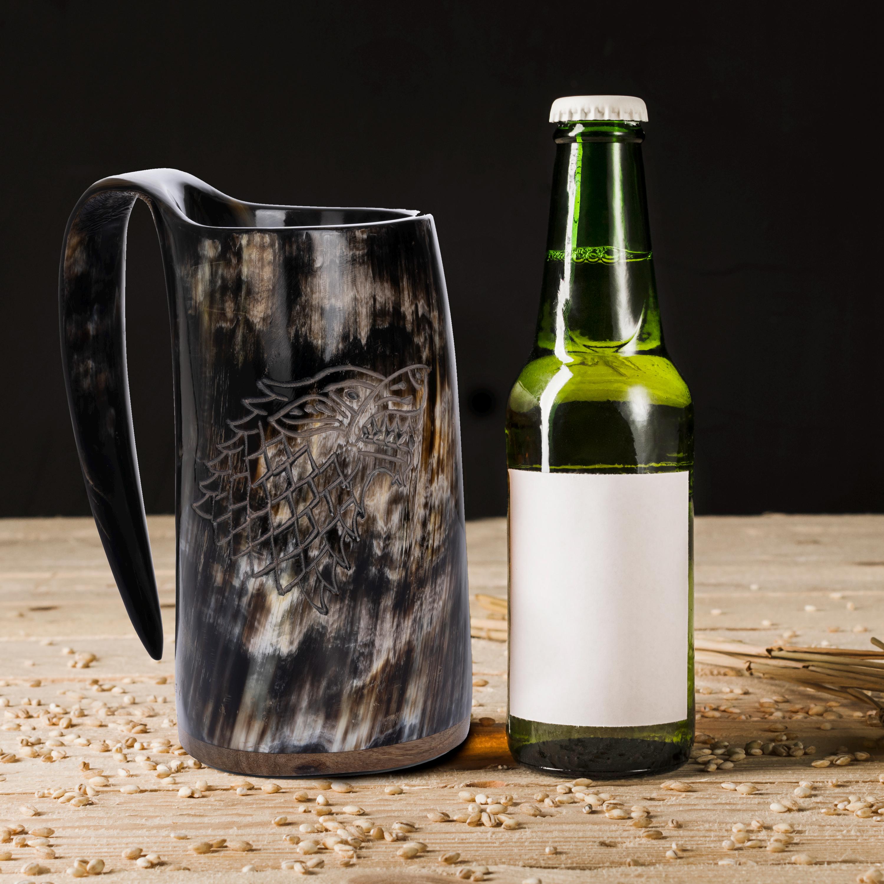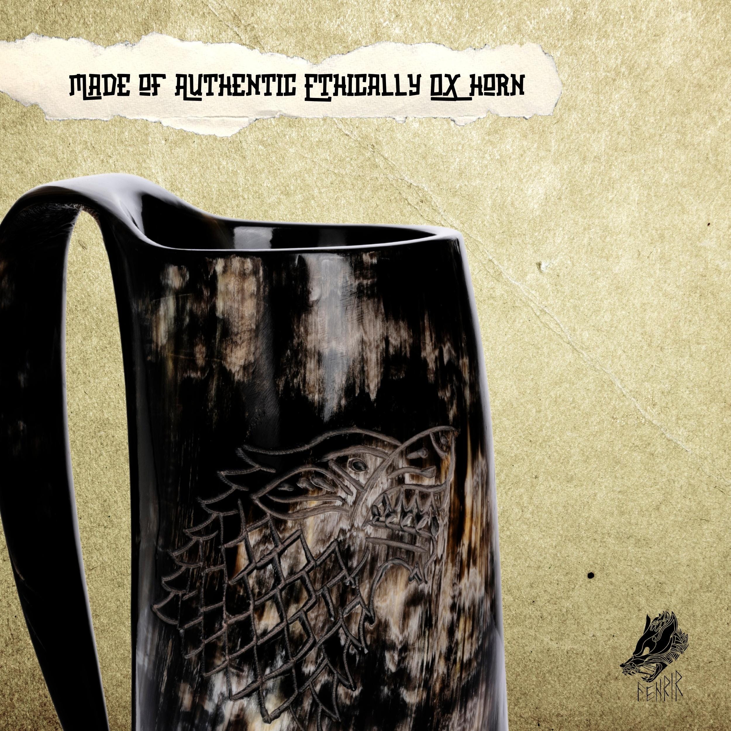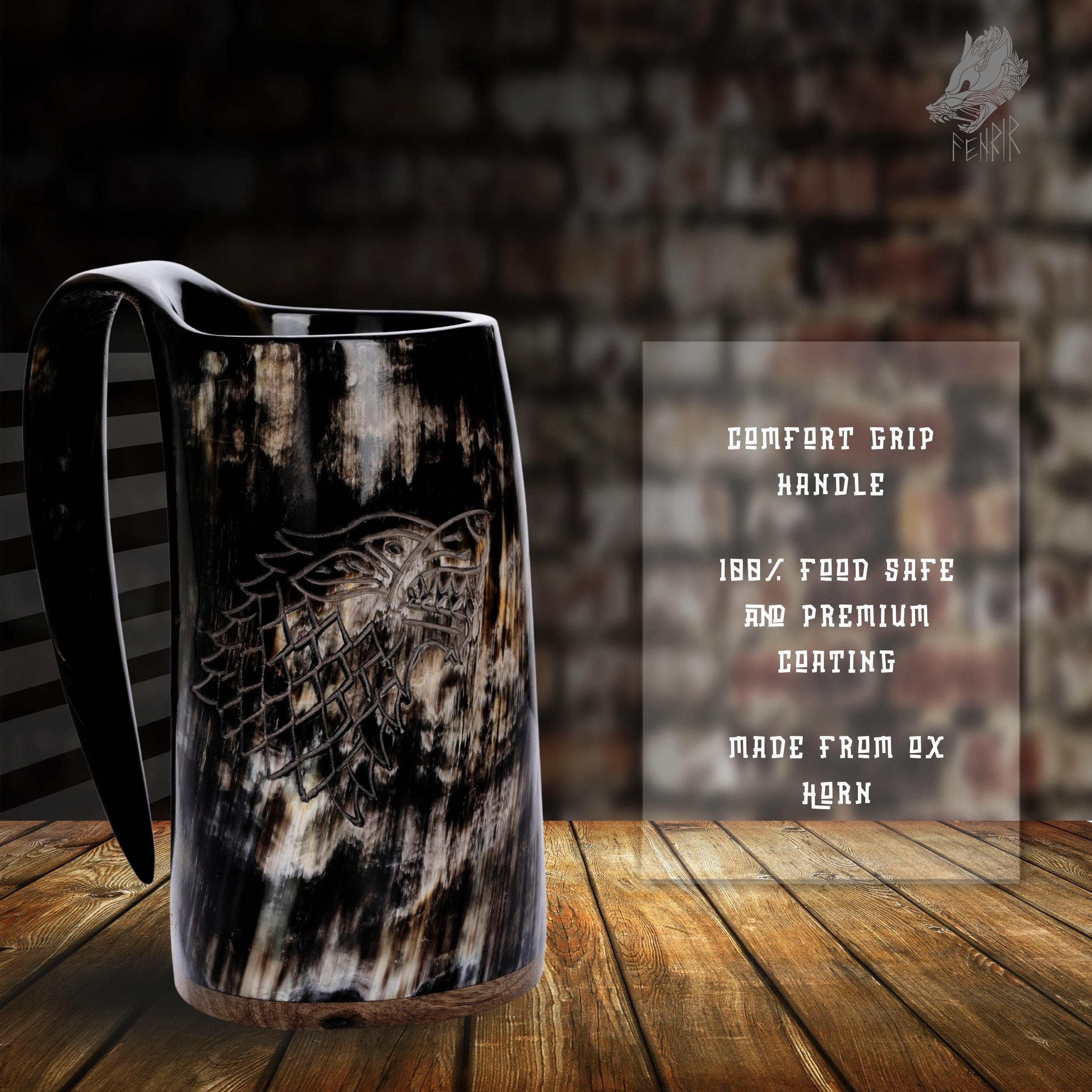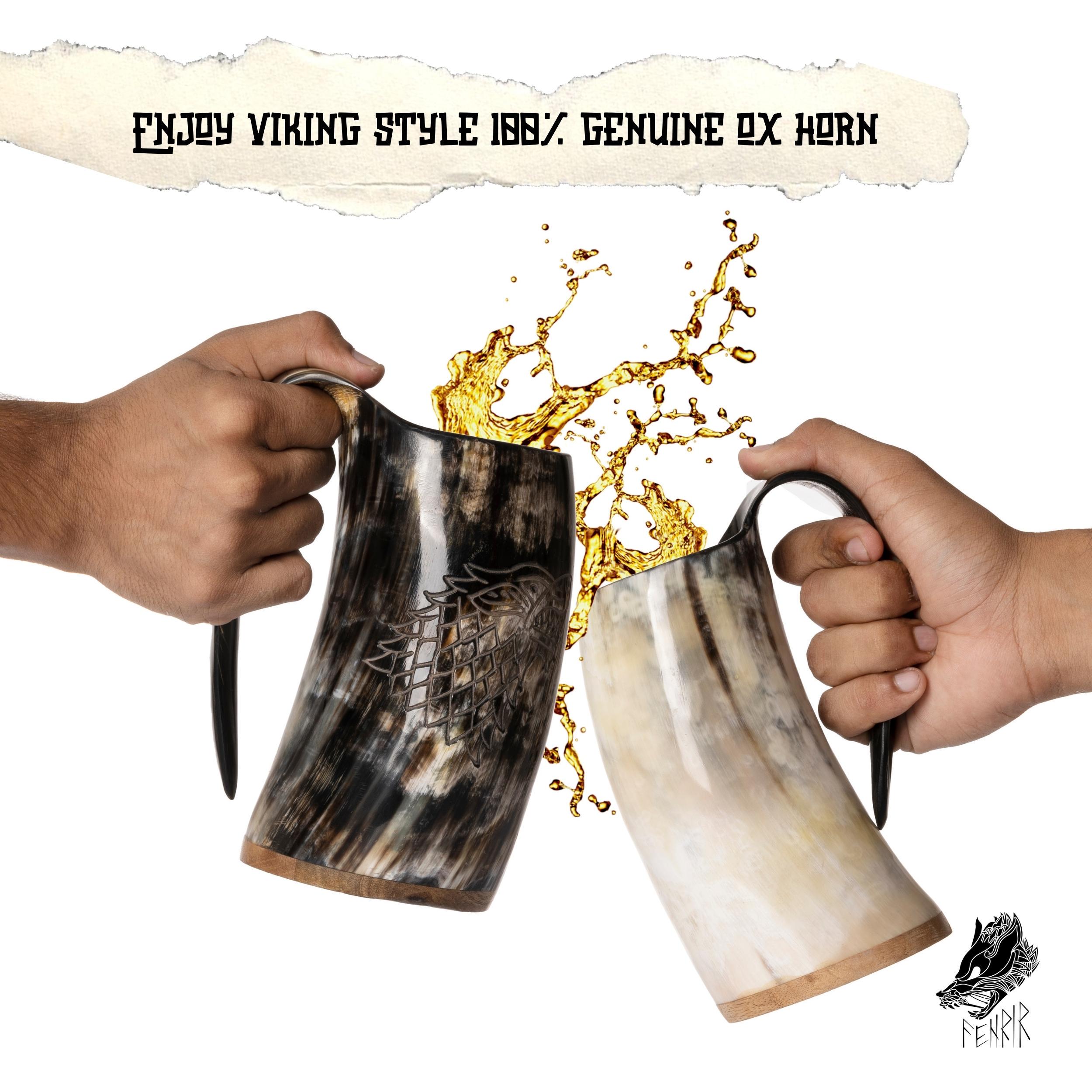 FENRIR VIKING DRINKING HORN MUG SET - The Fenrir viking drinking horn mug set is a combination that includes a Fenrir viking horn mug with a bottle opener that are stylish and durable viking horn products. UNIQUE HANDMADE OX HORN PRODUCT - Crafted from 100% authentic and ethically sourced ox horn, each FENRIR viking drinking horn mug is a testament of superior craftsmanship. Brace the spirit of the Norse with our handcrafted medieval style natural beer mugs. A PERFECT ALL-SEASON GIFT FOR MEN – A perfect gift for your husband, dad, or buddy on Christmas, New Year, Father’s Day, birthdays, or anniversaries. It’s a memorable way to celebrate any man who appreciates handcrafted quality and Norse-inspired design. GENUINE & FUNCTIONAL VIKING HORN CUP – With a generous 16 oz capacity, the FENRIR horn mug is perfect for enjoying beer, mead, ale, or any drink of choice. Each mug features a unique natural finish, ensuring no two are alike—giving you a truly one-of-a-kind, authentic Viking experience. PREMIUM QUALITY & GIFT-READY – Crafted from thick, sturdy ox horn with a food-safe polished finish and a 100% leak-proof bottom, the FENRIR Viking mug ensures a safe, long-lasting drinking experience. Comes with a free spirit gift bag to protect your set—perfect for gifting or storing between adventures.