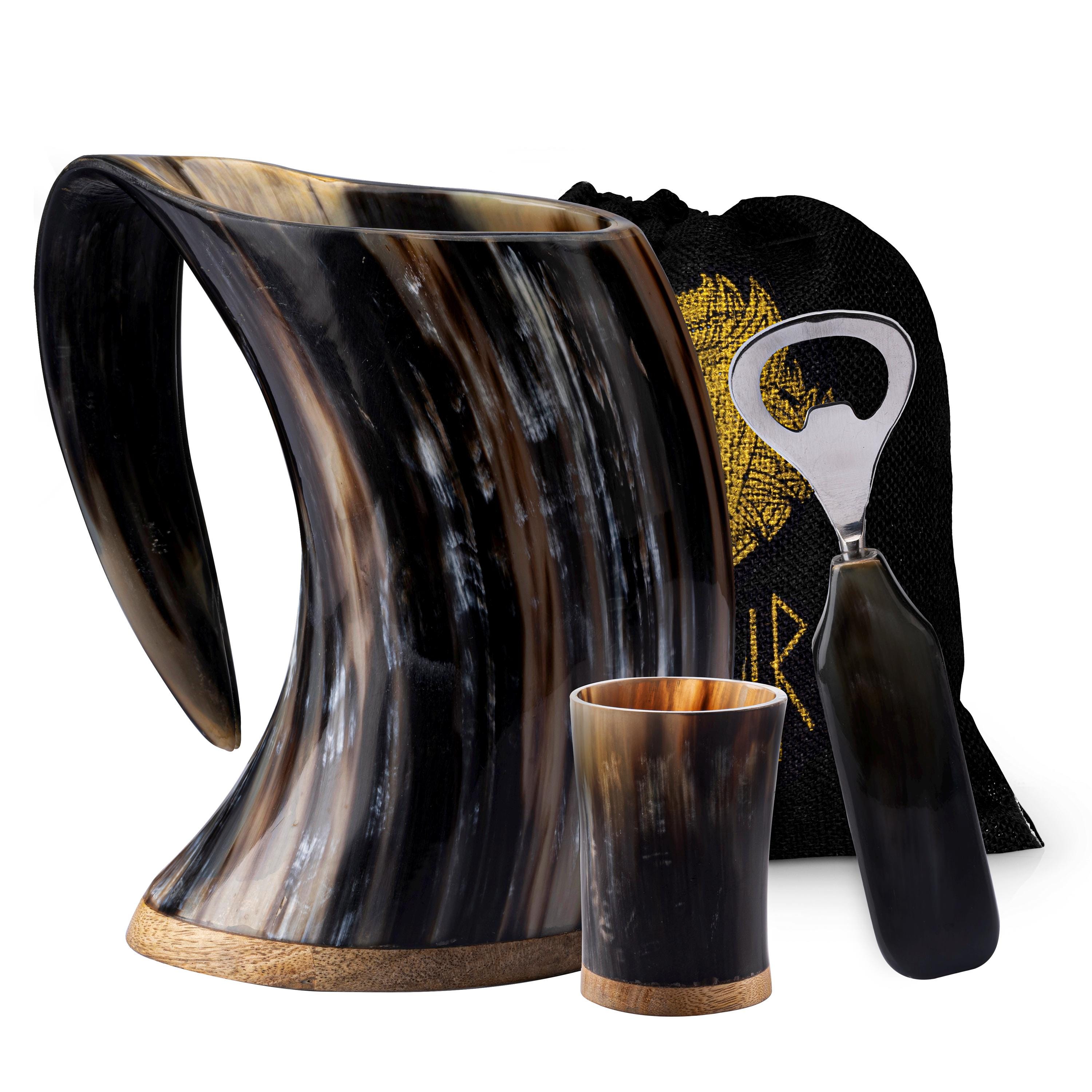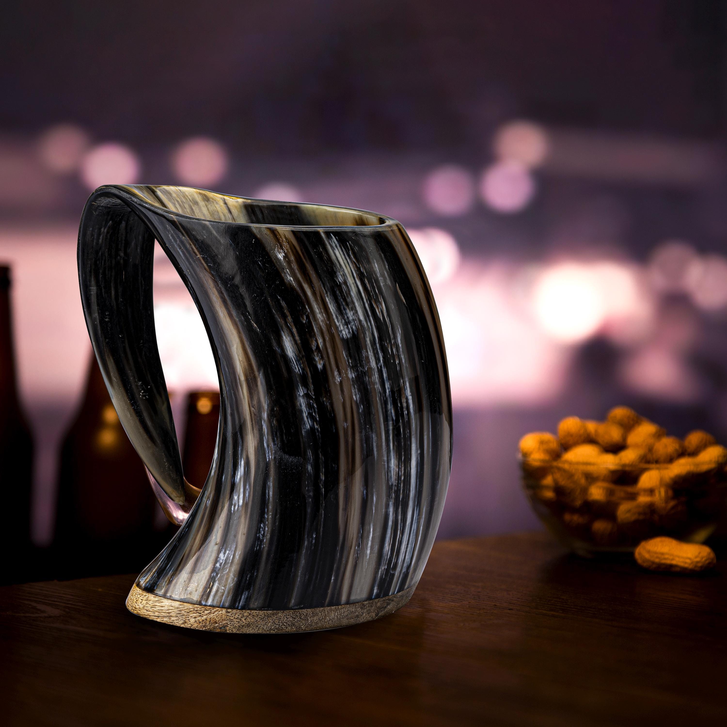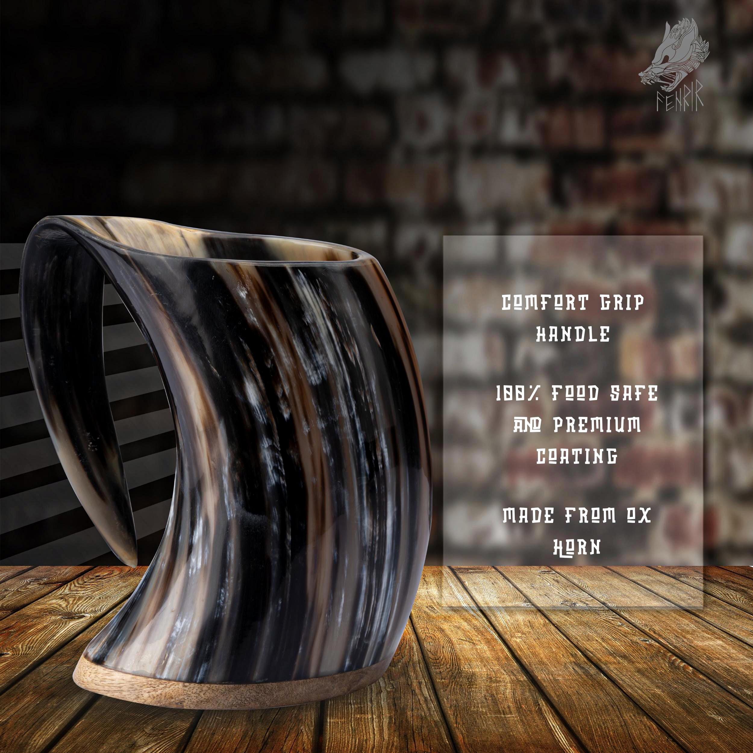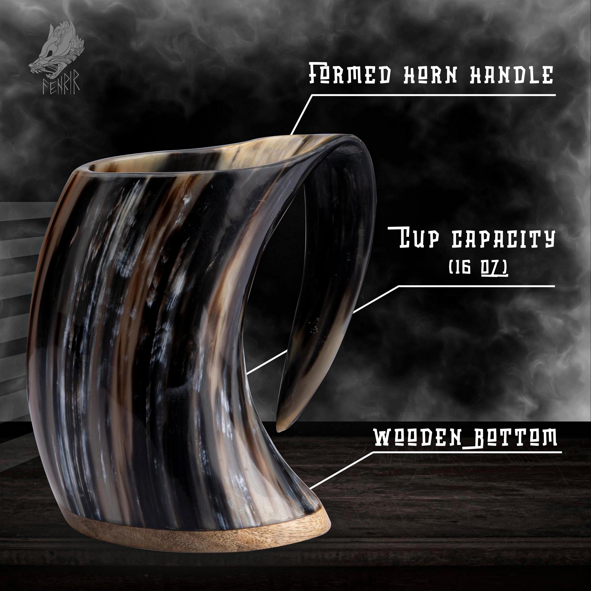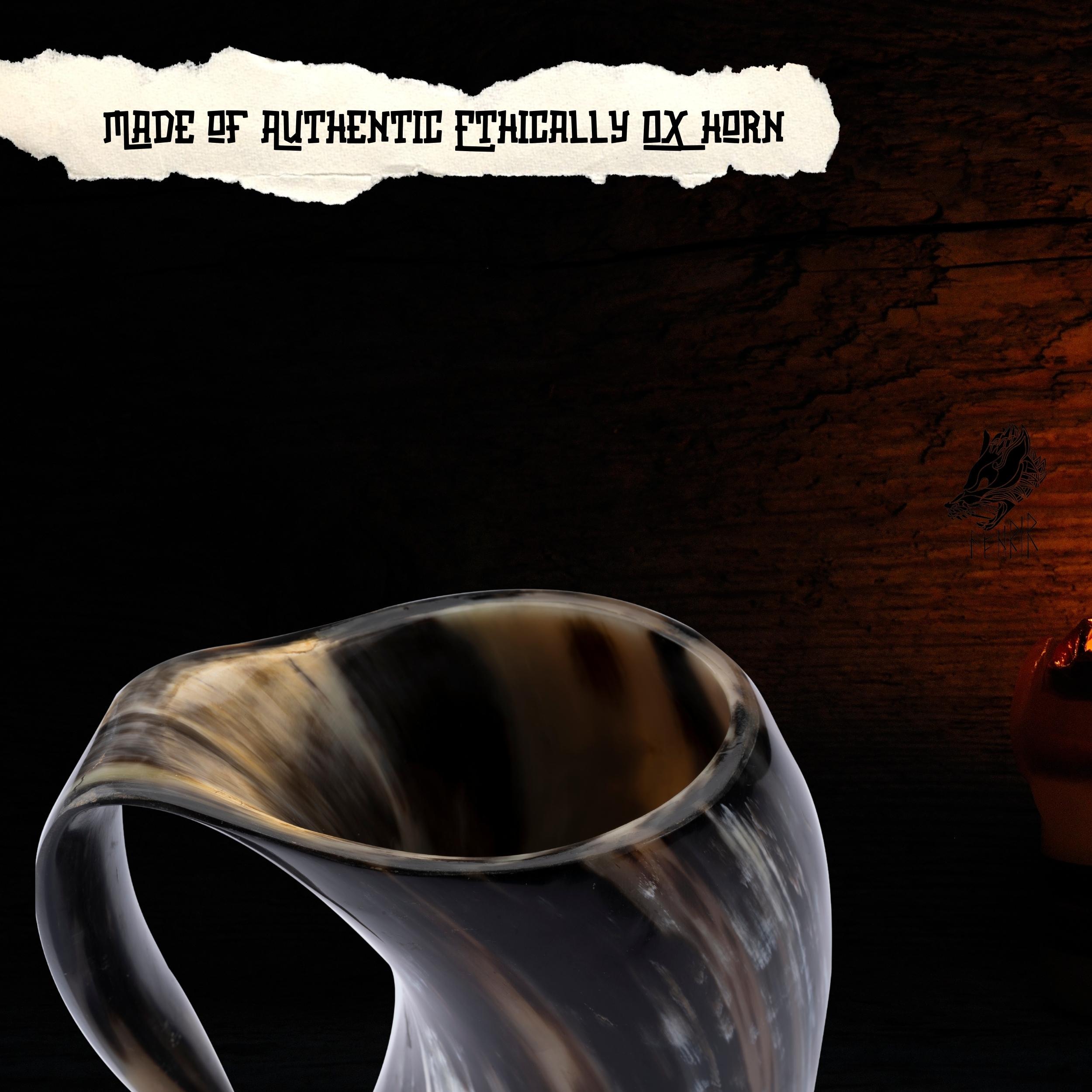 The FENRIR horn Mug Comes to 16oz to 20oz each Mug sizes and Shapes Are Different Also The Color is Organic We use high-quality materials and advanced manufacturing techniques to prevent any leaks from occurring Our product is designed and tested to ensure 100% leak-free performance. Drink like a warrior - Each tankard is painstakingly selected for appearance, durability, color pattern, and shape so that you can get an authentic experience of true drinking epitome. Each mug is unique in shape & color & comes in medieval packaging. Glass full of class - Each of our horn mugs is hand-selected, hand-cut, and hand-polished to near perfection by our artisans who have been fashioning drinking horns for generations. So when you pick up the mug of your Viking Ox horn mug, you do realize that it is 100% authentic and raw essence of elegance. Premium quality - The secret ingredient of a finely crafted mead horn Beer Tankard with Handle is the care that is put into the construction. The material used is durable and long-lasting and leaves no stone unturned to make it up to the notch. Care Instructions: Hand Wash Only